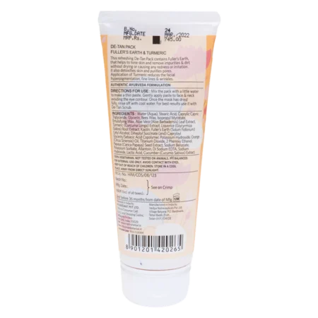 Guaranteed delivery on November 22, 2025BHD: 3.300 Incl. VATThis refreshing De-Tan pack contains Fuller’s earth, that heIps to tone skin and remove impurities & dirt without drying or causing any redness or irritation. It also detoxifies skin and purifies pores. Application of turmeric reduces the facial hyperpigmentation, fine lines & wrinkles.