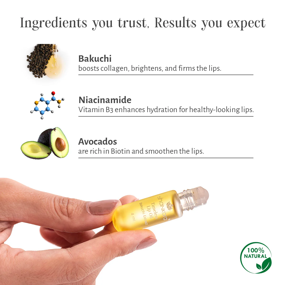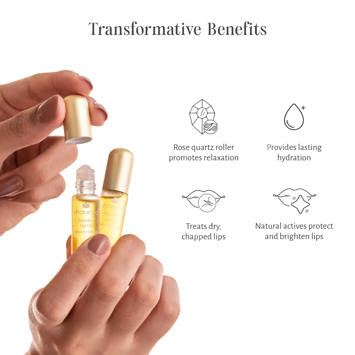 Timeless Lip Oil is a unique formula backed by both Ayurveda & modern science. The oil uses Bakuchi to increase firmness, Avocado oil to moisturize the lips & Niacinamide to lighten pigmentation. The oil post application with Rose Quartz gemstone roller leaves the lips feeling smoother & healthier.
