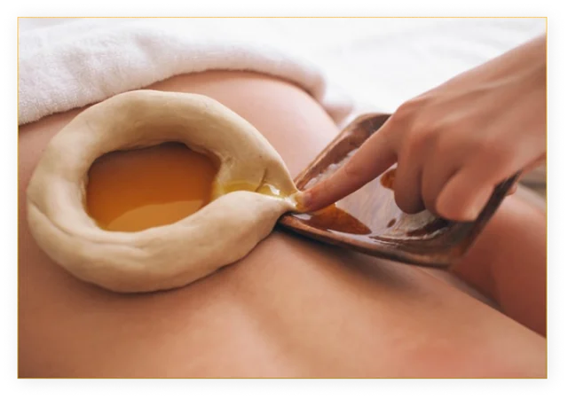 The person is allowed to lie on his/her stomach on a massage table The dough ring is about four to five inches in diameter and is placed on the back around the painful area. Usually, it is applied to the lumbar-sacral area of the spine, which is a major site of Vata.