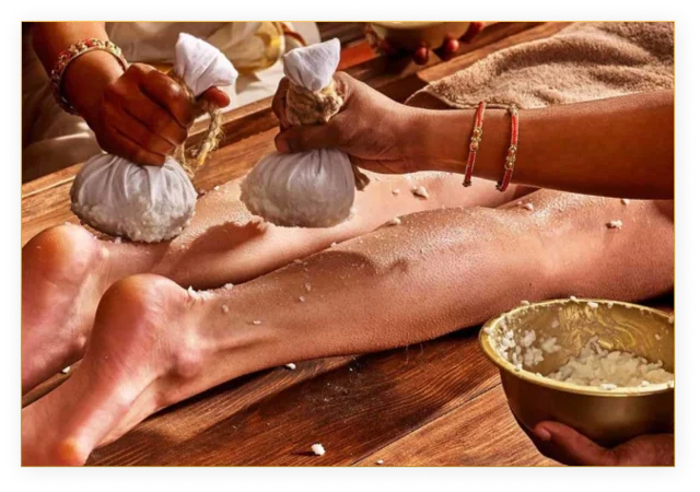 Navara Kizhi is performed by 4 attendants or masseurs (2 on each side of the body) who work in a synchronized manner. The poultices are dipped in the heated medicated milk and are rubbed and stroked on both sides of the patient’s body in a rhythmic way.